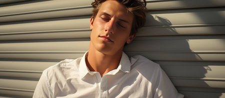 Portrait of a young man leaning against a wall with eyes closed