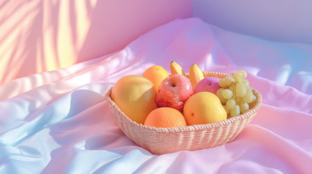 A beautifully arranged fruit basket featuring a variety of colorful fruits, including apples, grapefruit, and bananas, set against soft, luminous fabric for an inviting atmosphere.