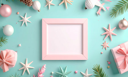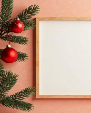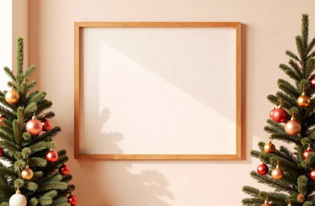 Mock up blank frame with christmas tree and decorations.