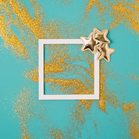 Square frame on a golden glitter pastel blue background. Minimal New Year flat lay