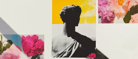 Minimalist collage featuring geometric shapes, flowers, and a statues shadow on a wall