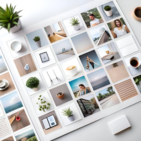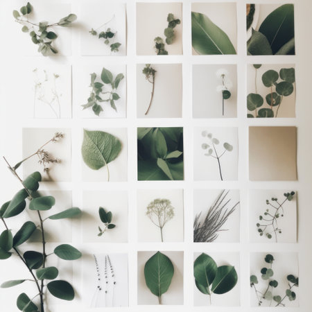 A flat lay composition featuring a grid of various items. including plants. cups. books. and even a person. This image is perfect for creating a mood board or showcasing a collection of diverse elements.