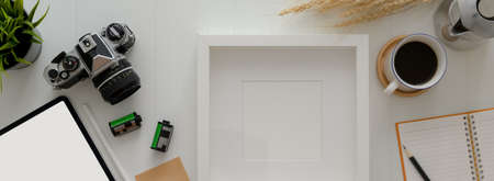Top view of home office desk with mock-up frame, camera, coffee cup and decoration on white table
