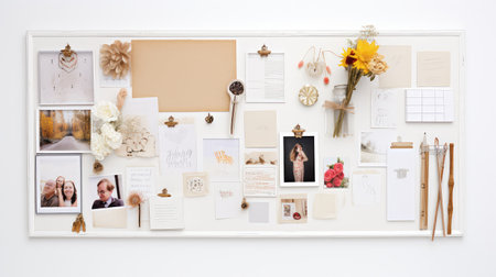 Neatly arranged collection features handwritten notes, dried flowers, and various textured papers in soft neutral tones, creating an artistic display.