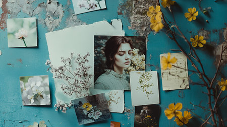 Artistic workspace featuring a central portrait photo surrounded by various images, sketches, and ephemera, showcasing a photographer's creative process.