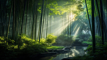 Sunlight filters through tall bamboo stalks in a tranquil forest, casting ethereal beams of light on the ground, creating a peaceful and enchanting atmosphere.