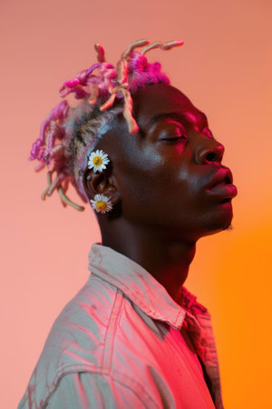 Portrait of a Young Man with Pink Hair and Flowers Looking Up at the Camera in a Dreamy and Playful Pose