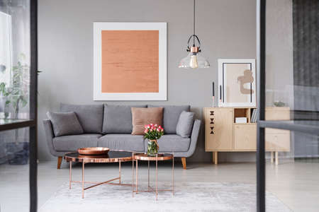 Flowers on copper table in front of grey couch in living room interior with rose gold poster. Real photo