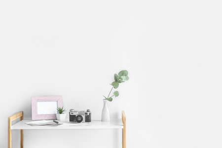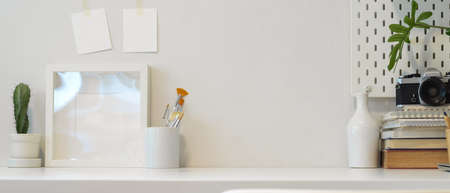 Close up view of workplace with copy space, books, camera, paint brushes and decorations on white table