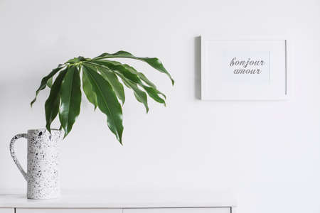 Minimalistic concept of white home interior whit copy space and tropical leaf. Scandinavian white cupboard concept.
