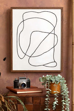 The stylish compostion at living room interior with mock up, design wooden sideboard and elegant personal accessories. Brown wall Cozy apartment. Home decor. Template.