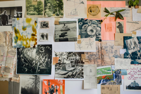 Various photos, articles, and sketches are displayed on a wall in a collage, A collage of photos, articles, and sketches representing a research project