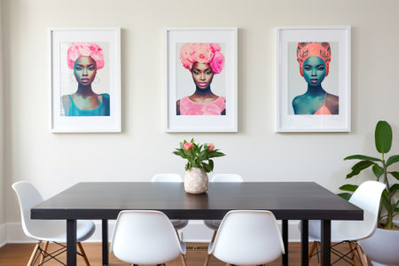 Interior design of modern dining room with furniture and photo frames.