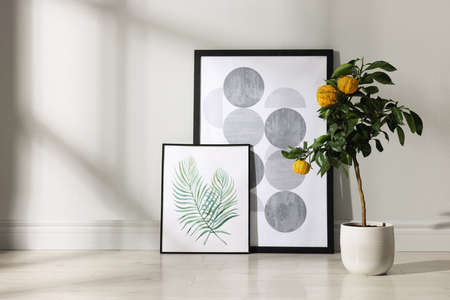 Potted bergamot tree with ripe fruits and pictures on floor near white wall indoors