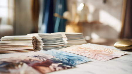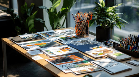 A vibrant workspace features a sunlit table adorned with colorful stationery, plants, and scattered design documents, perfect for fostering creativity and inspiration.