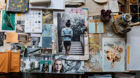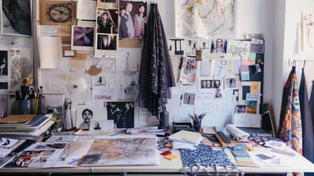 A fashion designer's workspace, filled with sketches, fabric swatches, and inspiration boards.