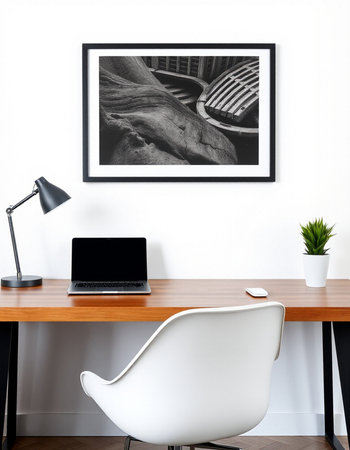 Large, framed portrait photo and a monstera plant in a classic workspace interior with an orange lamp on a wooden desk