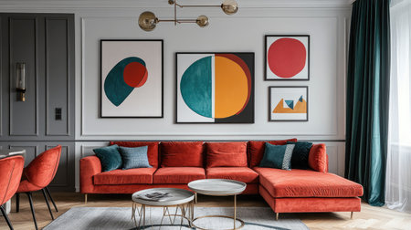 This chic living room features a red sofa complemented by modern art pieces, creating a vibrant and inviting atmosphere. The contemporary decor blends style and comfort.
