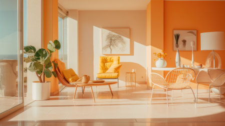 Cozy living room with pink peach fuzz color decor and sunlight through large windows, AI generated