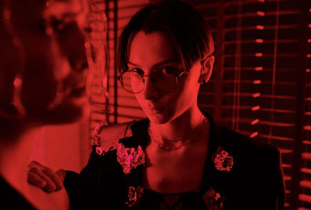 Serious teenage guy in eyeglasses and smart suit looking at camera while standing next to youthful girl during vogue dance in studio