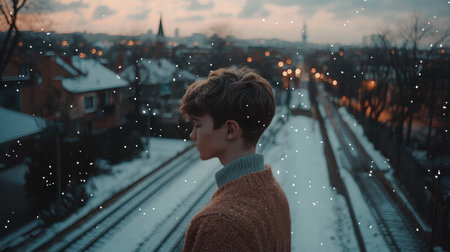 A young person stands in profile against a snowy cityscape, bathed in soft light, evoking a sense of peace and nostalgia in a quiet winter evening.