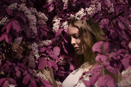 macro Portrait of a beautiful girl among red color foliage and flowers bird cherry