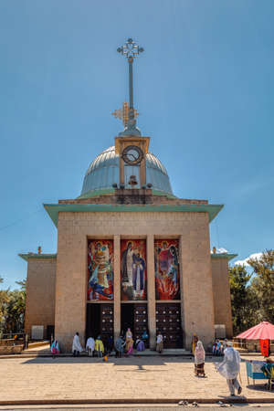 LALIBELA, ETHIOPIA, MAY 1st. 2019, Orthodox Christian Ethiopian believer in front of famous rock-hewn St. George's Church after Mass on May 1st. 2019 in Lalibela, Ethiopia
