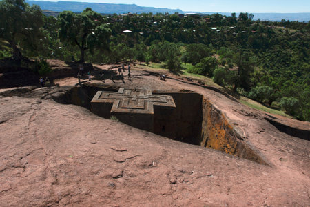 Lalibela, Ethiopia - Nov 2018: Bete Giyorgis or St. George church, monolithic church carved into stone in Lalibela, Ethiopia