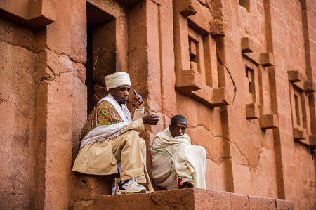LALIBELA, ETHIOPIA - SEPTEMBER 27, 2011: Unidentified Ethiopian religious man near the Lalibela church cut off the rock. People in Ethiopia suffer of poverty due to the unstable situation.