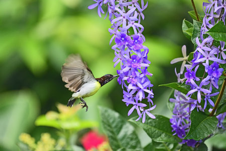 Purple Rumped sunbird with flowers close up photograph