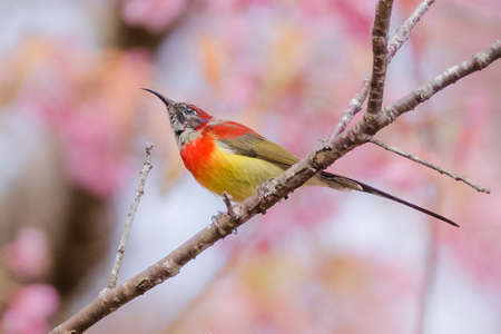 Sunbird bird, Gould's Sunbird with Sakura pink flower in Ang Khang Nation Park, Chiang Mai, Thailand.