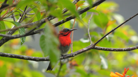 A male crimson sunbird is perching on a branch of East India screw tree and making calls.