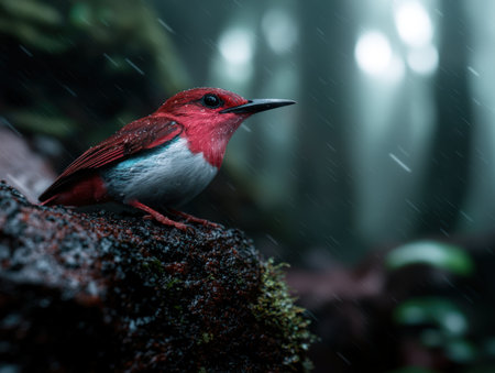 Crimson bird perched on mossy branch in misty rainforest.