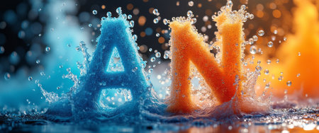 The image showcases the letters A and N dramatically emerging from a splash of water, surrounded by vibrant blue and orange hues. This captivating scene evokes a sense of energy and creativity, symbolizing the fusion of art and nature in a playful dance of color and motion.