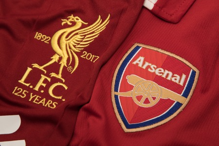 BANGKOK, THAILAND - SEPTEMBER 19: The Logo of Liverpool and Arsenal on Football Jerseys on September 19,2017 in Bangkok Thailand.
