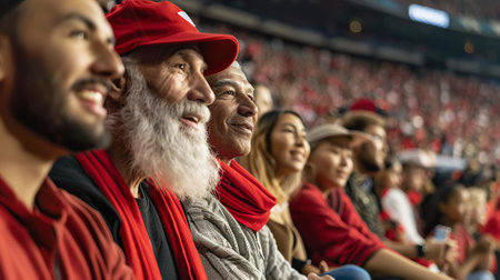 A vibrant scene capturing excited sports fans wearing colorful scarves, showcasing their team spirit and camaraderie in a lively stadium atmosphere.