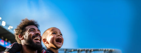 Father and son in stands, filled with enthusiastic supporters rugby team. French rugby 2023. Moment, where passion for rugby units generations and ignites the sense of shared triumph. Generative Ai content.