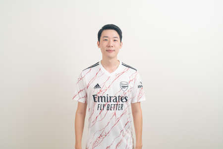 Bangkok, THAILAND - Nov 27, 2021 : Young Asian man wearing Arsenal shirt with white background. Arsenal football club is a famous team in London city.
