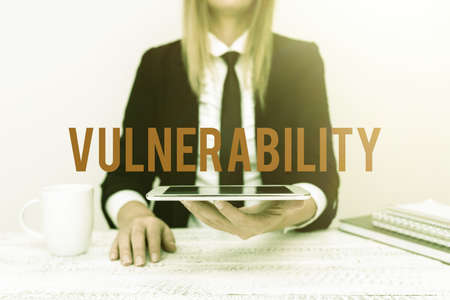 Conceptual caption Vulnerability. Word Written on State of being exposed to the possibility of being attacked App Developer Presenting New Program, Displaying Upgraded Device