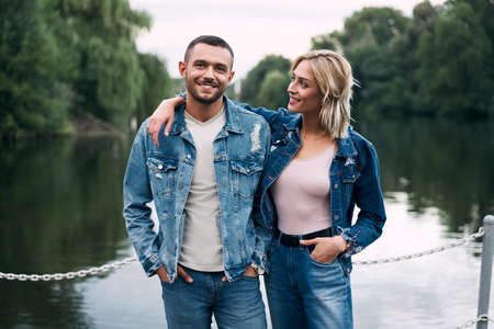 Young couple hugging and smiling at each other on the river bank. Walking along the sandy beach
