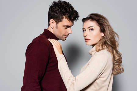 side view of casual young couple in turtleneck jumpers isolated on gray