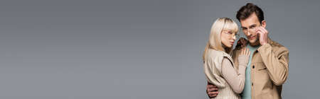 woman in faux fur jacket hugging elegant man in suit outdoors, banner