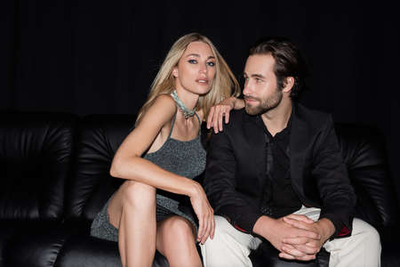 Sexy woman in dress looking at camera near boyfriend in jacket on leather couch isolated on black