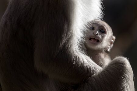 Baby monkey with mother, close-up portrait. Macro photography.