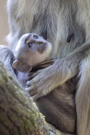 Gray langur monkey family sitting on tree.