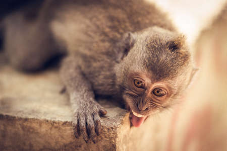 Little baby monkey (Macaca mulatta) eating in Sacred Monkey Forest. Ubud, Bali, Indonesia