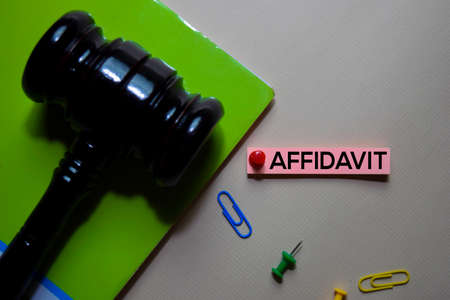 Affidavit text on sticky notes and gavel isolated on office desk. Justice law concept