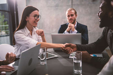 Happy diverse multiethnic business partners shaking hands at teamwork meeting. business team executive leaders making handshake agreement successful company trade partnership handshake concept