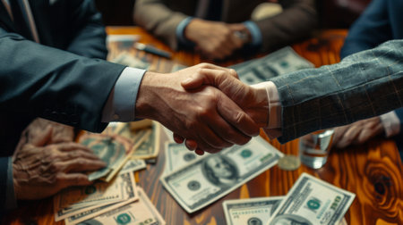 Closeup of a handshake between two businesspeople with money on a table, signifying a prosperous financial deal