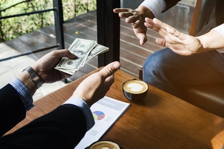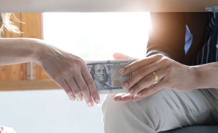 Picture of two people handing over a dollar, they are business partners who are doing corrupt behavior by bribing them for illegal mutual benefit. The concept of business fraud and bribery.